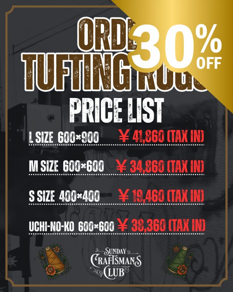 期間中、オーダータフティングラグの各サイズが30%OFF にてお求めいただけます。
